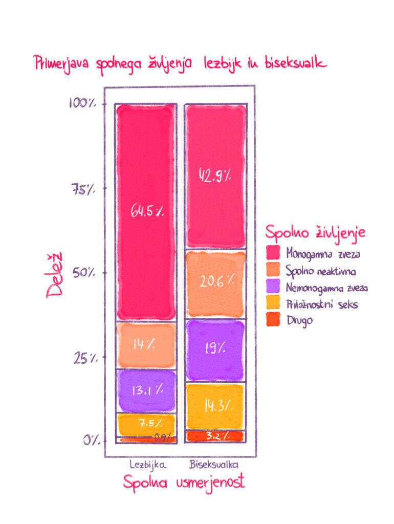 Stereotip, da so biseksualke pogosteje v nemonogamnih razmerjih, kot kaže v Sloveniji drži. (Nemonogamija pomeni na primer odprte in poliamorne zveze – da si ne bi kdo predstavljal kakšnega varanja!) Hkrati pa je tudi večji delež biseksualk od lezbijk, ki spolno sploh niso aktivne.