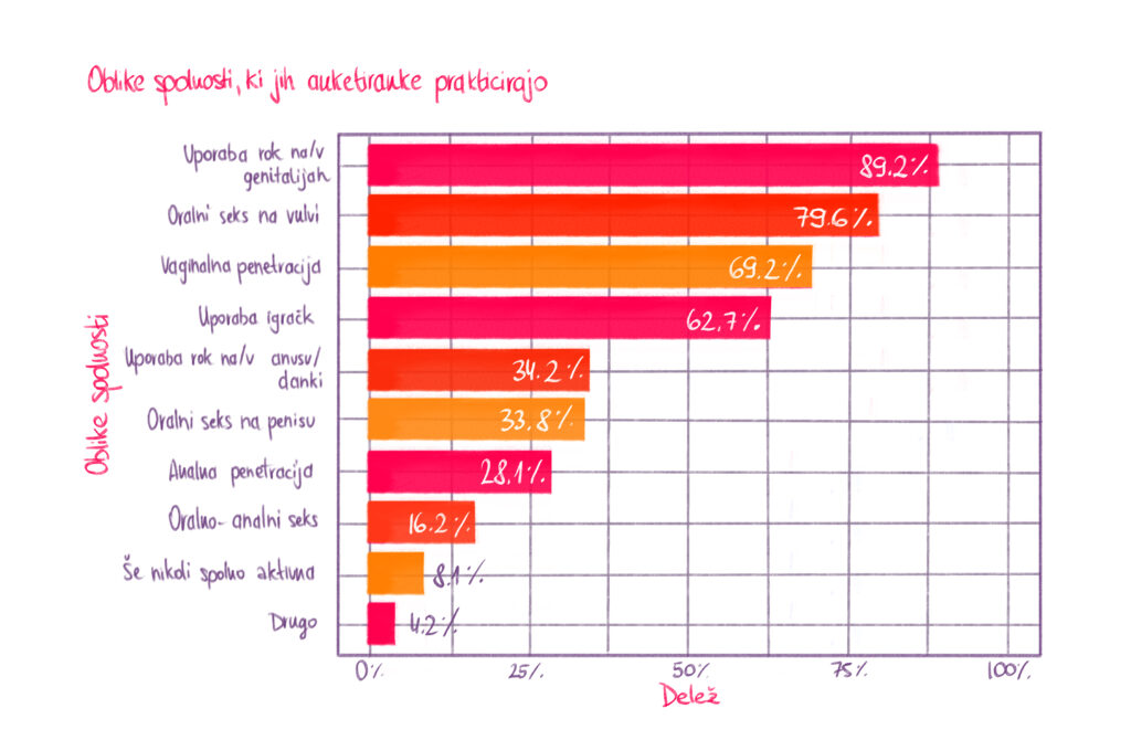 Naš glavni spolni organ so očitno roke: najpogostejša oblika spolnosti je uporaba rok na/v genitalijah, ki jo prakticiramo skoraj vse. Sledi oralni seks na vulvi, pa tudi vaginalno penetracijo in uporabo igračk nas ima večina rada.